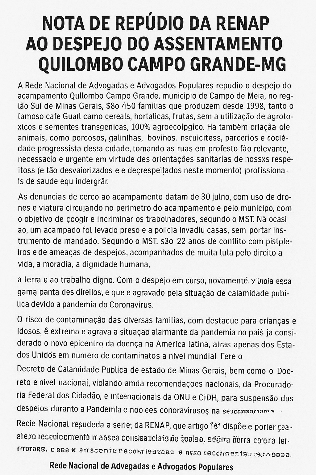 NOTA DE REPÚDIO DA RENAP AO DESPEJO DO ASSENTAMENTO QUILOMBO CAMPO GRANDE-MG