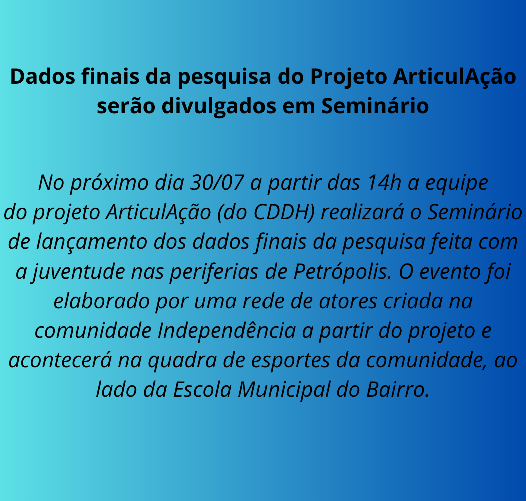 Este é o segundo evento desenvolvido pelo grupo, que foi criado a partir do trabalho do Projeto ArticulAção, voltado para jovens moradores das periferias da cidade de Petrópolis. Em agosto a Rede realizou um Seminário para divulgar os Dados Finais da Pesquisa elaborada pelo projeto.