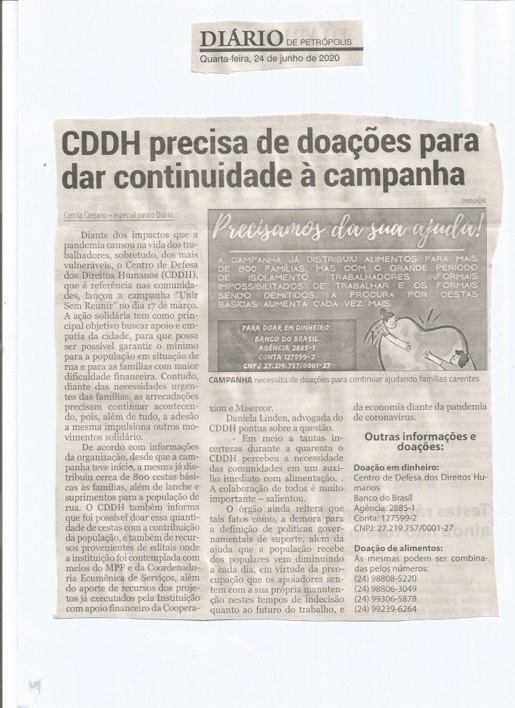Diário de Petrópolis – 24-06-2020 – CDDH continua a arrecadação de cestas básicas para ajudar famílias de Petrópolis